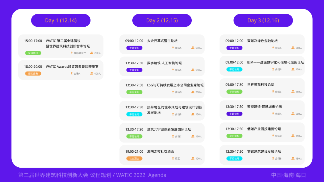 备受全球建筑业关注的WATIC 2022 第二届世界建筑科技创新大会将于2022年12月14日至16日在中国·海口举办。本届大会以“数字建筑·绿色未来”为主题,关注ESG及可持续发展、双碳及绿色金融、数字化转型、人工智能、智能建造、元宇宙、基建科技等领域,关注各领域的技术形态、产品形态,以前瞻性,开放性,兼容性和有效性为核心打造。邀请各个领域专家代表共同探讨。
